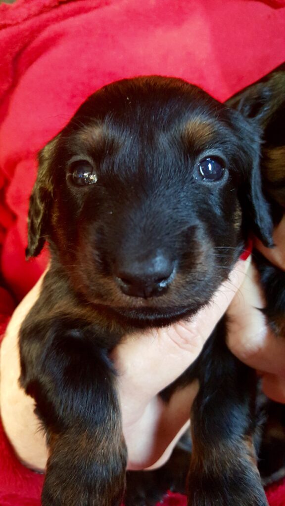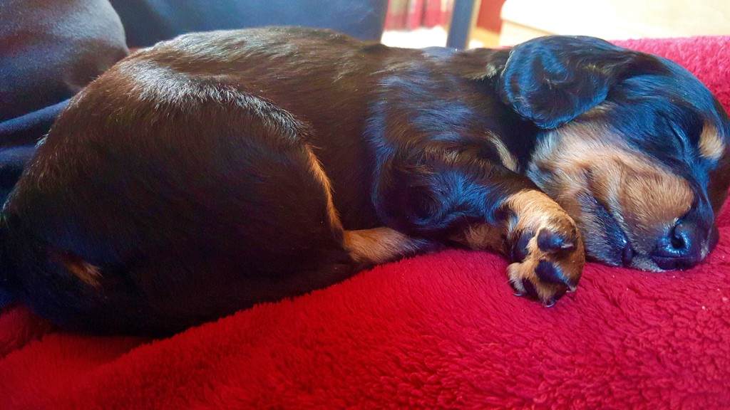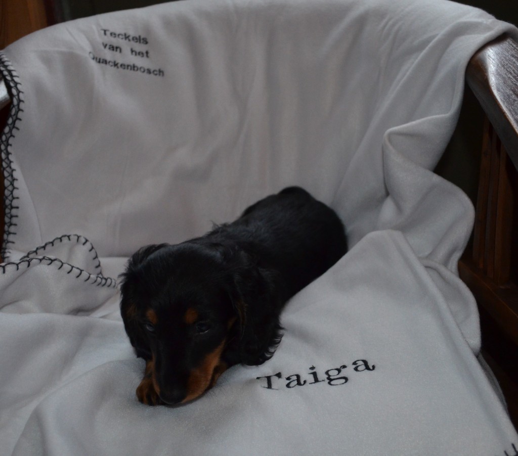 De laatste pup is op 19-2-2016 uitgevlogen en nu kan ik, vol trots, een gedeelte van de kraamcadeaus laten zien. De fleecekleed met daarop de kennelnaam en de roepnaam van de teckel, is gemaakt door Daniëlle van Baaren van @Made by Daantje. Vanaf nu is zij onze hofleverancier wat betreft persoonlijk kado voor nieuwe baasjes.