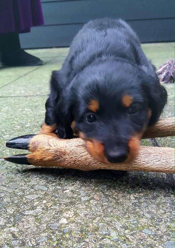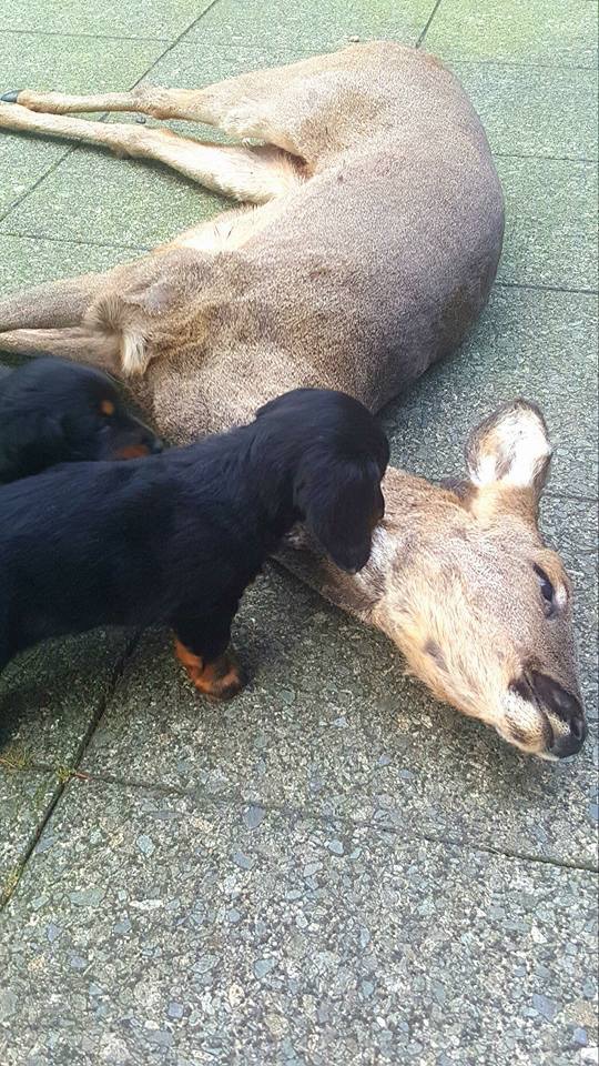 De pups zijn hier 5 weken oud en kwamen voor het eerst in aanraking met een dode ree. Hun jachtinstinct kwam gelijk naar boven.